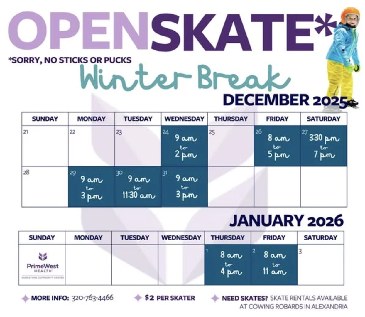 Take a break this holiday season and enjoy ice skating in Alexandria, MN! Stay active, make memories, and spend time on the ice with friends and family.