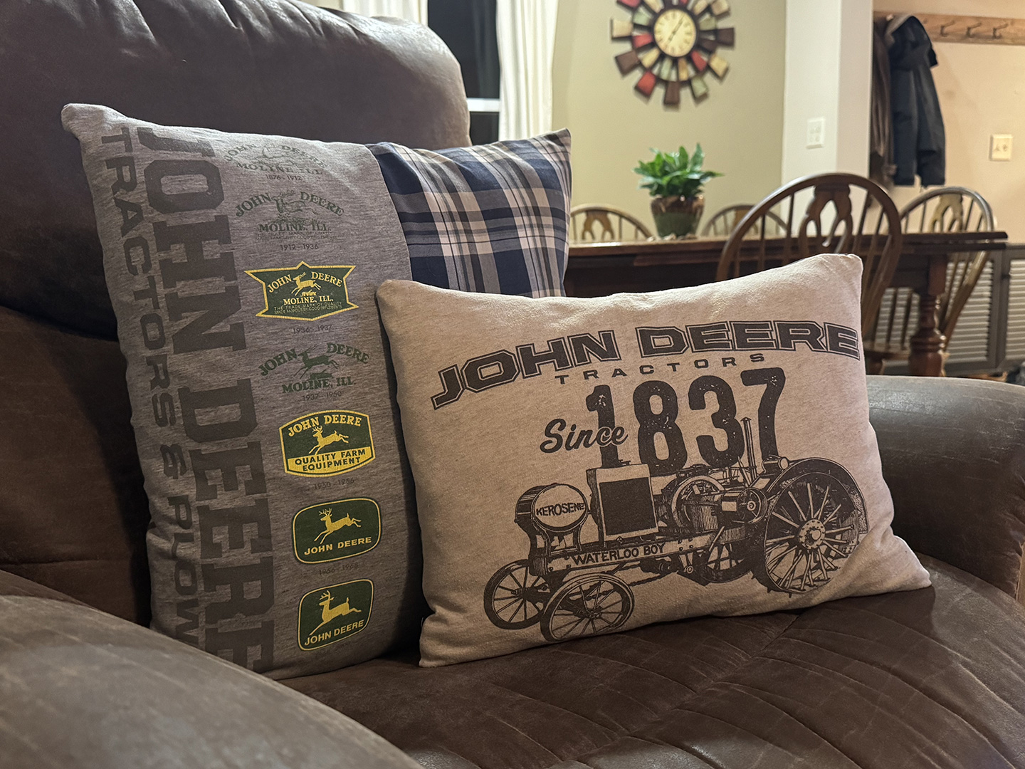 Pillowcases at hand. For the one with the documentation of all the John Deere logos, the front was two sections. To get enough button down for my two pillows, I had to add a third section of fabric on both 'backs'. Not quite as simple, but doable. Done.