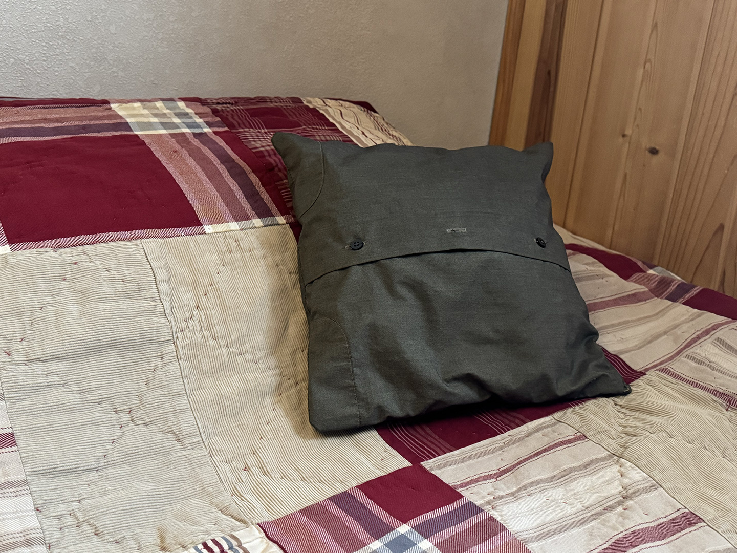 These kits consisted of a little pillow, and three pre-cut pieces of fabric, impossible to mess up. One piece from the back of a dress shirt, and two from the front. The front pieces were key. They button together, which lets the pillowcase open and close, allowing you to stuff the pillow after sewing is complete (and remove it for washing). You simply pin and sew the front and back together. And it was simple. They still have those little pillows on their beds, though they never picked up an interest sewing.